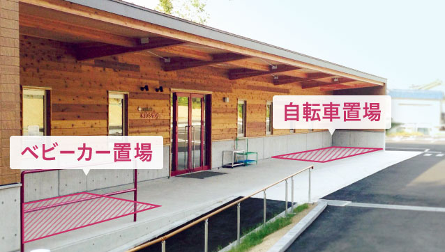 駐輪場・ベビーカー置き場があります。ベビーカーはたたんで所定の場所へ置いてください。お荷物をベビーカーや自転車のカゴに入れたままにしないようにご注意ください。