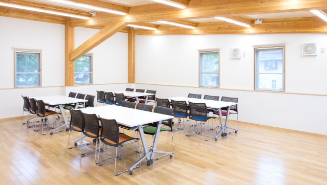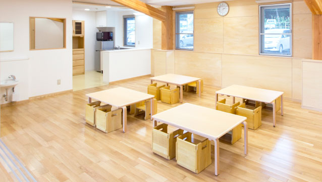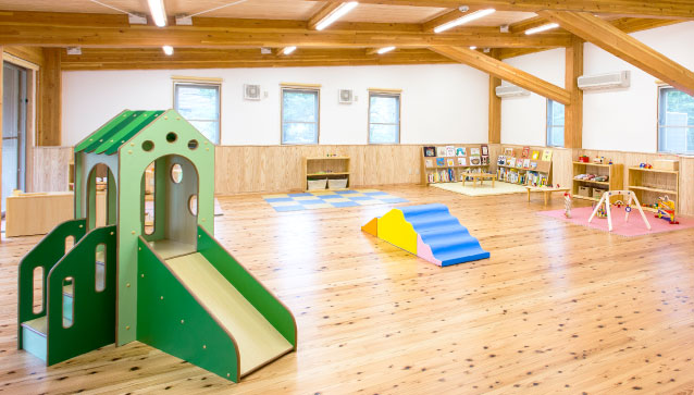 おおむね0〜2歳児の子ども達と保護者の方を対象とした場です。木の香りに包まれた暖かな部屋に、年齢にふさわしい良質なおもちゃや絵本などを揃えました。