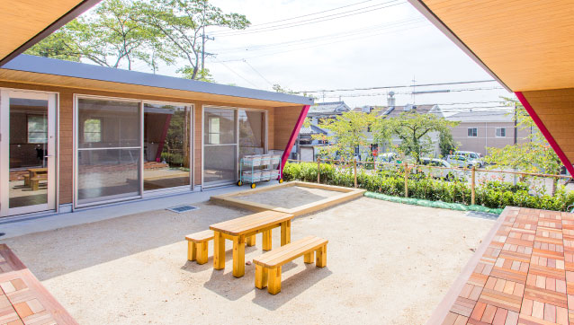 季節ごとに変化する光や風を感じながら砂場遊びや水遊びが楽しめます。砂・水に関わってたっぷり遊びましょう。温水シャワーも完備しています。