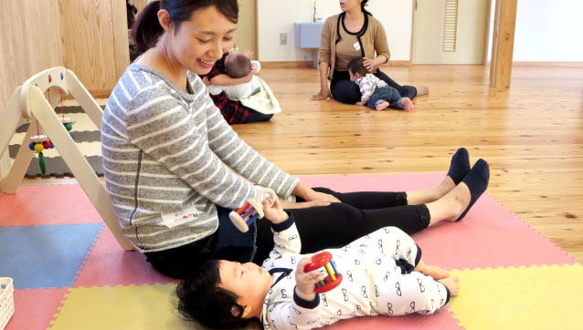 ママのあたたかな見守りの中、寝返りをしたり手に持たせてもらったおもちゃから聞こえるやさしい音色に耳を傾けたり…。穏やかに流れる時の中で、自分が生まれたこの世界に出会っているようです。