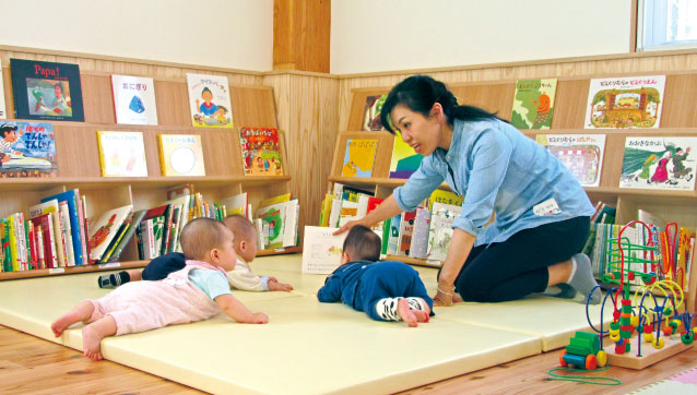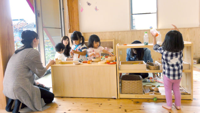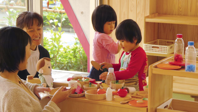 中庭に面した陽当たりのよい場所に、ままごとコーナーはあります。1歳半から盛んになる見立て遊びが充分に楽しめるよう、おうちのような畳敷きのコーナーに、キッチン、食材、調理器具、ちゃぶ台を用意しました。三つ子ちゃん人形もお世話をしてもらうのを待っています。