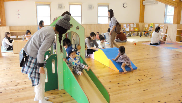 お座りから、ハイハイ、立っち、つたい歩き、一人歩き、走る、跳ぶ…。この運動機能の発達が著しい時を生きる子ども達が、一人ひとりのペースで進んでいけるように、床材は子ども達にやさしい柔らかなスギ材を用い、探求心を誘う遊具を置きました。