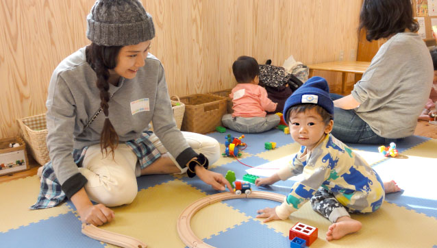 2歳に近づくと指先の機能も発達していきます。パズルなどを繰り返し行い、達成感を味わいながら、この遊びを自分のものとしていきます。また、見立て遊びも楽しい時期です。ブロック遊びやレール遊びなど、大人に助けてもらいながらイメージしたものを自分で形にするおもちゃを準備しました。