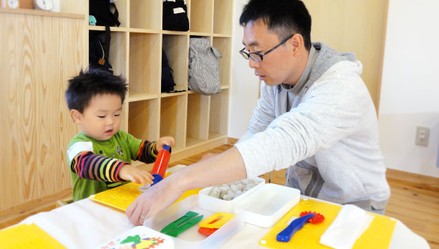 パパと一緒に粘土遊びに挑戦です。珍しく平日にお休みが取れた親子のひと時をパチリ。周りのモノに働きかけ、遊びながらその性質を知り、創造していく喜びを知っていく時期です。お絵描き、粘土遊び、新聞紙遊びなど、身近な素材を用いた遊びもたくさんさせてあげましょう。